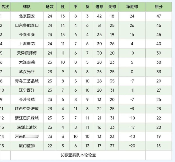 2007年中超联赛积分榜(适度第25轮):